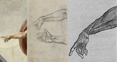 这幅画左边是上帝之手,中间是上帝之手的草稿。拿它和《人体的构造》中174页的插图对比,我们会惊奇地发现,怎么是抄过来的呢?