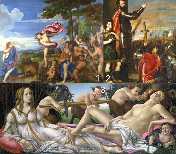 在这幅提香·韦切利奥的《酒神巴克斯与阿里阿德涅》(图1)中,我们看到酒神巴克斯指向远方的那只手;在《阿方索的训示》(图2)之中,可以看到这个人指向上方的手。在桑德罗·波提切利的《维纳斯与战神》(图3)中,也出现了这个手势。