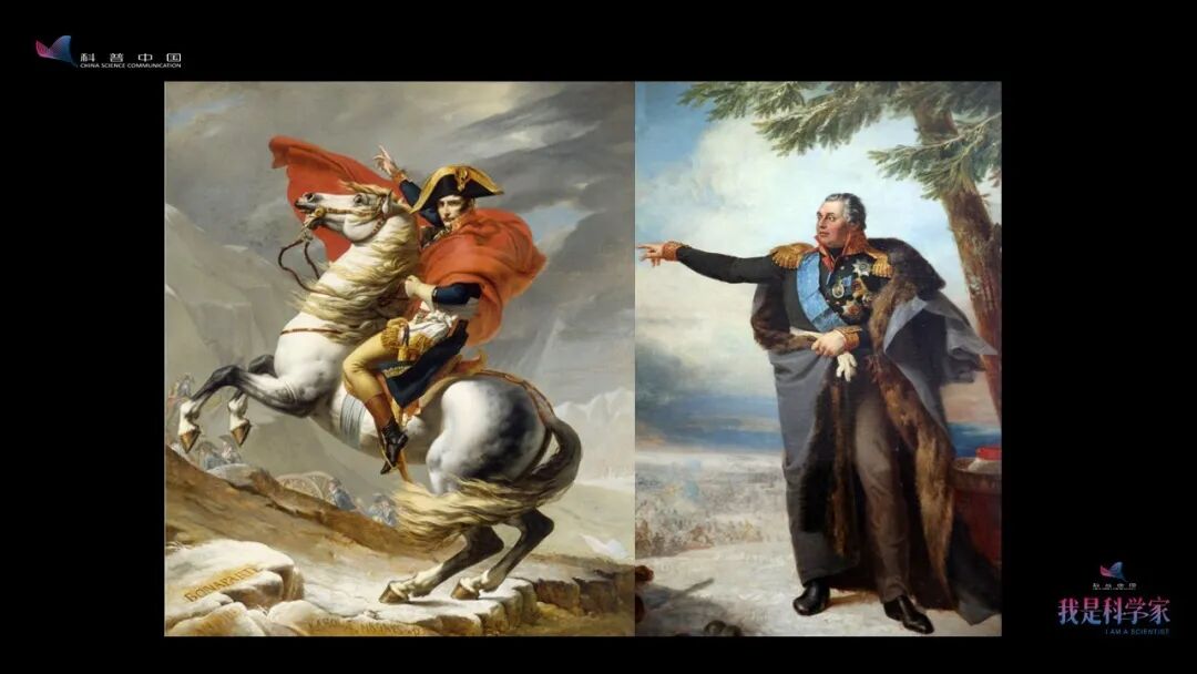 下面左侧这幅画大家是不是看着更眼熟了?对,这是新古典主义非常著名的画家雅克·路易·大卫的《拿破仑翻越阿尔卑斯山》。而右面这个人在医学史上非常神奇,叫米哈伊尔·伊拉里奥诺维奇·库图佐夫,两次颅脑贯通伤,幸运地活了下来,从此思维异于常人。也正是他,在拿破仑入侵俄国的战争中奋起反抗,击败了拿破仑的军队。这对老冤家在军事上针锋相对,但他留给世人的形象却是如此地相似——这个手势代表了权利。