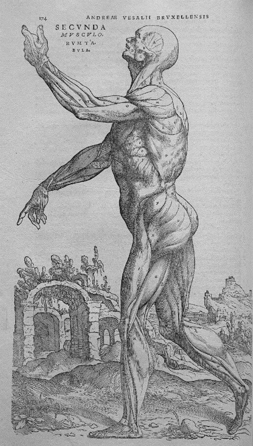 提到医学史,大家一定会想到在医学的奇迹之年——公元1543年,两位医学生出版了自己的作品。第一个是哥白尼发表了《天球运行论》,第二个是解剖学的创始人安德烈·维萨里。“维萨里”的意思是黄鼠狼,所以他的解剖图谱最上面画了三只黄鼠狼。这位“黄师爷”的作品里有着非常优美的插图。让我一眼就沉醉其中的是第174页的这幅插图,我觉得这里面包含了很多吸引人的东西。
