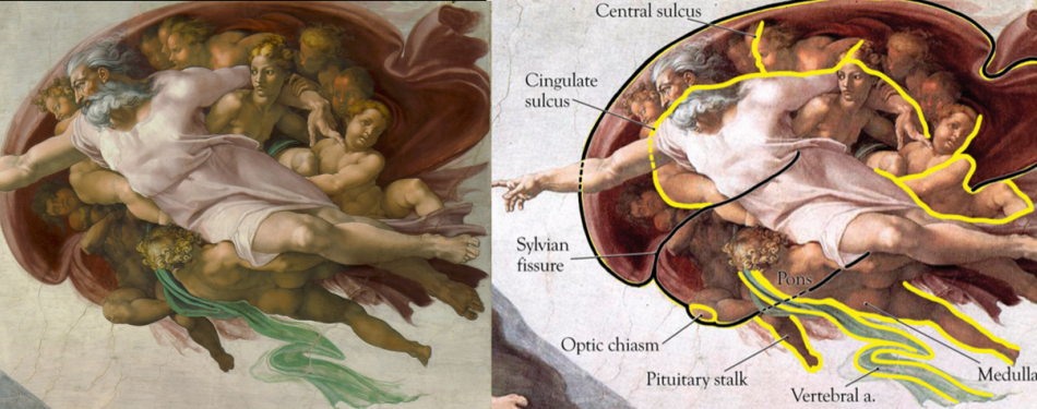 后来,伟大的艺术家米开朗基罗在教堂的穹顶上画下了不朽的《创世纪》。这幅画跟解剖学也特别有关系。尤其是“上帝创造亚当”的这部分,曾经有两个神经专业的大夫一抬头——诶?这不是画了个大脑的剖面图吗?为这个事他们还发了一篇文章。