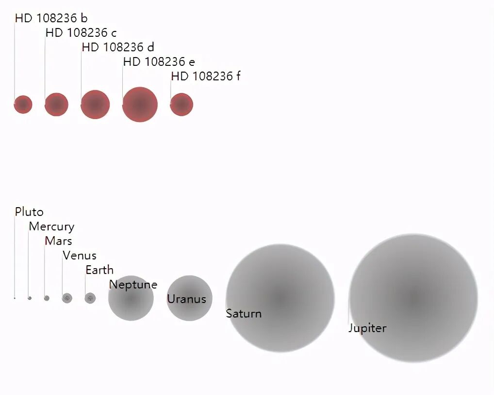 而在我们的太阳系里,最内侧的水星距太阳5800万公里,绕太阳一周需要88天,而最外侧的海王星则需要165年!如此近的距离,居然还存在三颗气态行星,目前来看实在有些不可思议。按太阳系来说,内太阳系4颗行星,包括2.3亿公里外的火星形成时都是岩石星球,在HD 108236中这四颗星球距母恒星都不足2100万公里,按理说炙热的太阳风早该把它们的气体吹走得差不多了,更进一步的研究或许能够为我们带来更准确的结果。