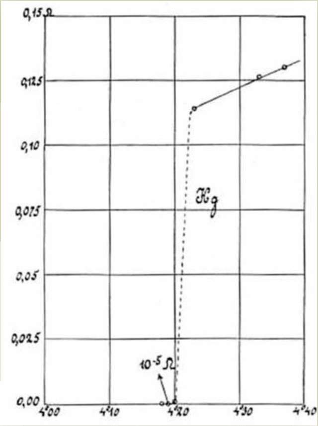 昂内斯判决性的实验完成于1911年4月8日,他测量了水银的电阻随温度的变化曲线。实验在早上7点开始,下午4点整,实验出现了一个连他自己都无法相信的结果——在4.2K的温度下,水银的电阻突然消失了!