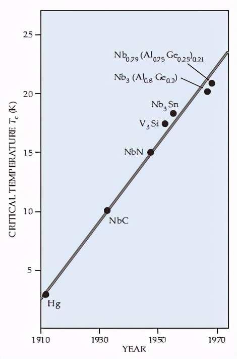 1970年代之前超导临界温度提升与时间呈线性关系