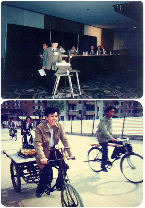 上图:赵忠贤在伍德斯托克物理大会上做报告。下图:赵忠贤会后回京骑三轮车为家里拉蜂窝煤。