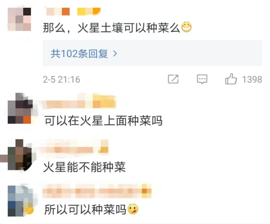 2月5日晚天问一号完成第四次轨道中途修正传回首幅火星图像↓↓↓△图片来源:国家航天局(点击图片查看详情)网友纷纷点赞“中国力量”:“中国航天太厉害了!”“加油!期待更多好消息!”另一个问题随之刷屏火星上能种菜吗??此前,嫦娥五号完成我国首次月球采样返回任务网友就在问,月球上能种菜吗?可惜答案令很多人遗憾:不能有网友大呼失望表示“可惜了那么大块地”也有人笑称“中国人,种菜魂!种菜真是中国人的执念”院子里、阳台上、地砖缝隙中……你能想到的地方都能种!中国人到底有多喜欢种菜?这么说吧勤劳的中国人民看到一块空地首先想的十有八九是:“这地方拿来种菜多好啊!”“这地方种点啥好呢?”一对定居在澳大利亚的夫妻丈夫是英国人,妻子是中国人丈夫在自家花园种了很多花直到妻子把母亲从中国接到了澳大利亚画风就开始变了……不过,对中国人来说在园子里种菜,只能算常规操作我们种菜的地方一直在突破想象有院子的种院子没院子的种阳台花盆能种蒜塑料盒能发豆芽△图自@音然-什么?有饮料瓶!很好,拿来种菜!有塑料管子!没问题,拿来种菜!连地砖的缝都不放过……这可真是“见缝插菜”!但这些都不算什么更硬核的还多着呢在营地种菜在荒岛种菜在海滩种菜在高寒区的哨所种菜在南极种菜在太空种菜中国人民的勤劳智慧确实在种菜这件事上展现得淋漓尽致!这也怪不得“火星上可以种菜吗”受到这么多网友关注这次,让我们期待我国完成火星采样返回任务的那一天能告诉我们关于火星更多的答案来源:央视新闻综合中国青年报等