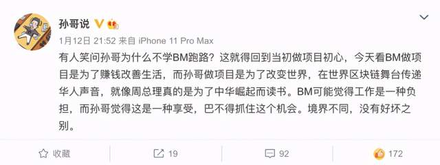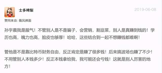 在区块链圈内有一群以“老韭菜”自居的投资者们,他们本身没有办法分清楚真的信仰者,还是一毛不拔的口头情怀者,有时候是不是真的敢砸钱,反而成为一种更为直接有效的识别方式。对币乎网友“@士多啤梨”有过一段中肯的评价,颇能代表区块链圈一部分人对于孙宇晨的认可。