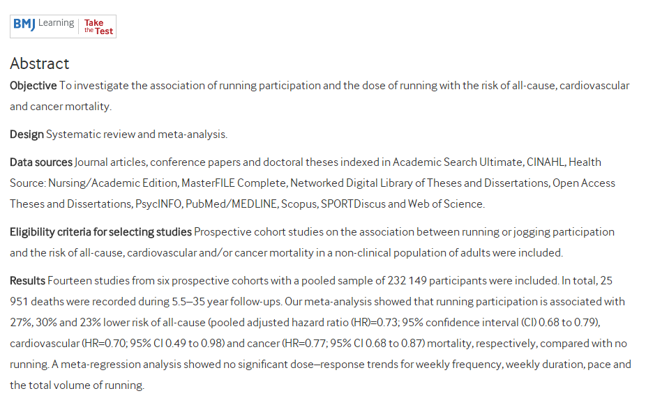 澳大利亚维多利亚大学的研究人员发表在《英国运动医学杂志》上的一项新研究表明,每周跑步一次,每次不超过50分钟,速度低于8公里/小时,对健康即有显著好处。 研究人员评估了25951名在研究期间死亡的参与者的跑步活动后发现,在不同的参与人群中,任何程度的跑步者都会将因任何原因死亡的风险降低27%,因心血管疾病的死亡风险降低了30%,因癌症的死亡风险降低了23%。