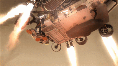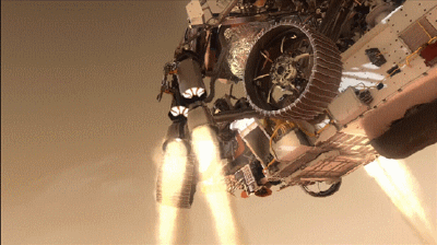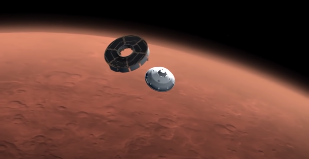 在进入火星大气层阶段,位于下降段的毅力号将首先与飞船主体分开,然后调整方向,让隔热罩面向前方,以正确的角度进入火星大气层,这将使用后壳上的小型推进器来完成。进入大气层后下降段将经历1300摄氏度的高温,这个阶段的任何错误都将是致命的,没有任何补救的机会,比如进入大气层角度稍有偏差,毅力号就会像打水漂一样被弹回太空成为太空垃圾,或者在火星大气层里燃烧成灰烬。类似灾难此前已经发生过一次,那就是1999年NASA的火星气候轨道器,在进入火星轨道过程中本来不该进入火星大气层的,结果输入推力参数时使用了英制单位磅而不是公制单位牛顿,导致其轨道过低冲进了火星大气层,让可能并不存在的火星生命免费欣赏了一把远道而来的昂贵地球焰火表演。