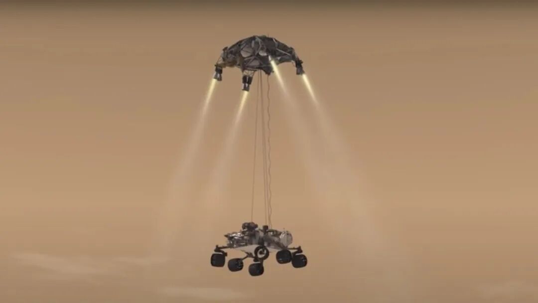 降落主要分大气阻力减速、超音速伞降和天空起重机降落三个阶段。