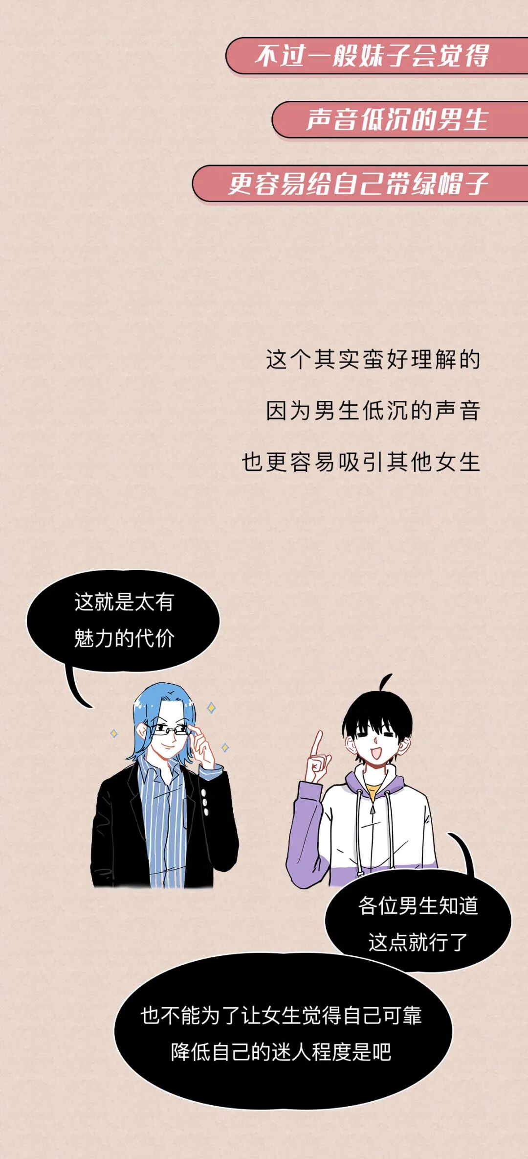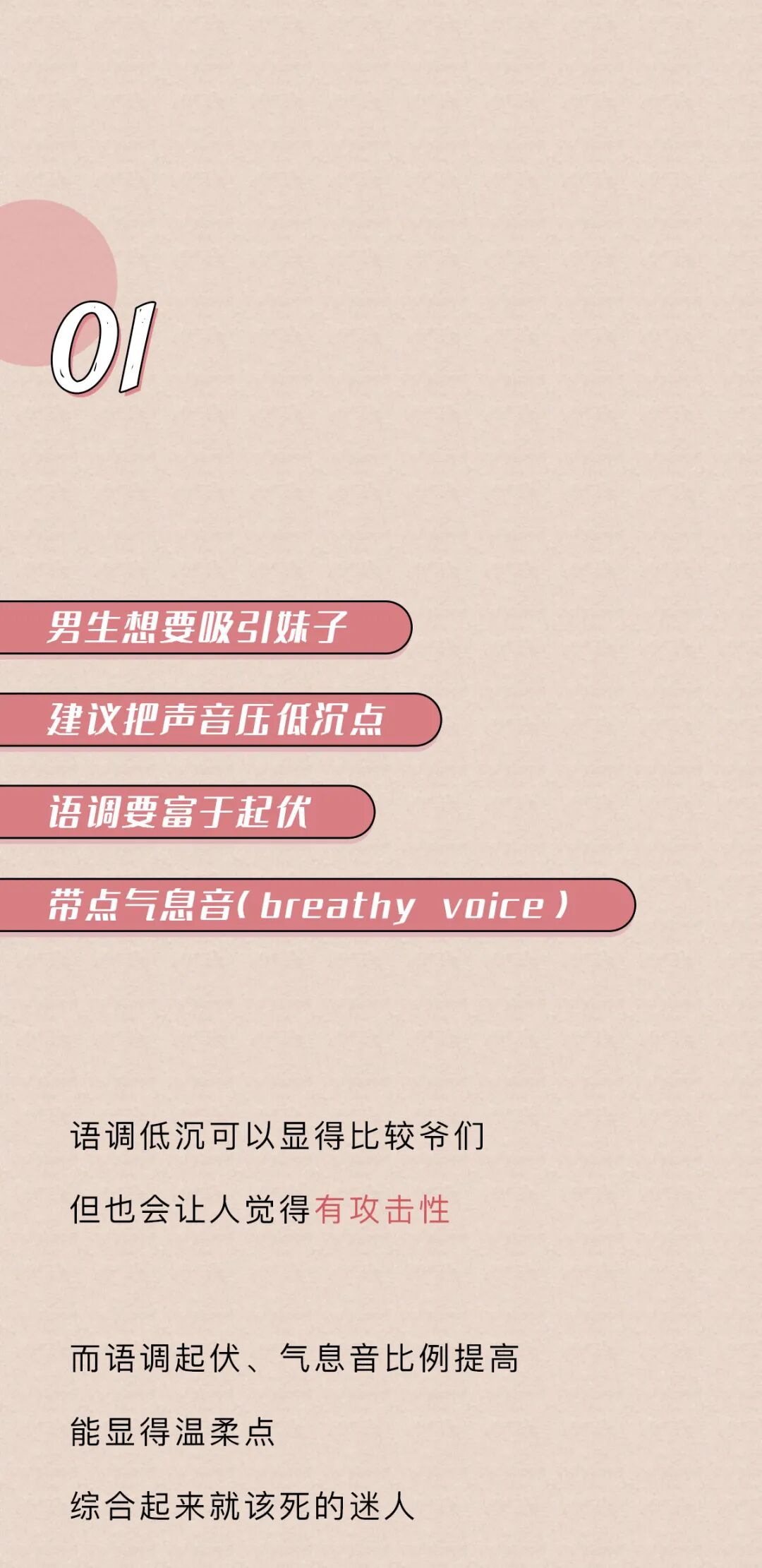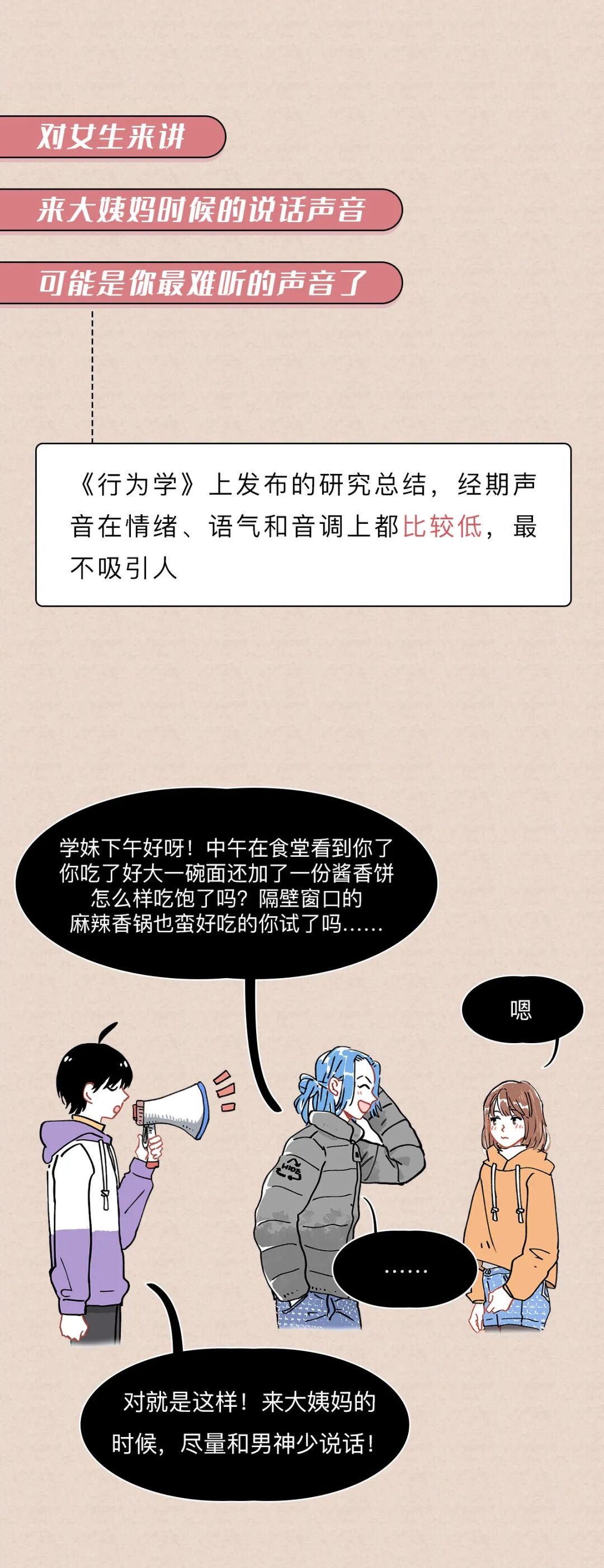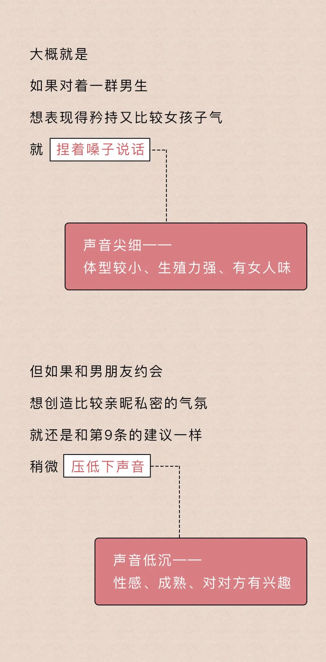 低沉的声音能让人觉得,男生长得高大,强壮有力,生殖能力强,嗯最后一点有点争议语调的结论来自苏特兰斯特林大学的研究;气息音的结论来自英国伦敦大学学院的语言学家许毅的研究《Evolutionary Psychology》上的《Your Cheatin’ Voice Will Tell on You: Detection of Past Infidelity from Voice》提了这事来自《Royal Society》上的文章《Voice pitch modulation in human mate choice》,上面说到的《Your Cheatin’ Voice Will Tell on You: Detection of Past Infidelity from Voice》也提了这事姨妈期声音不好听那事,是美国亚当斯州立学院的Nathan Pipitone和纽约州立大学奥尔巴尼分校的Gordon Gallup做的测试,他们招了10个妹子,让她们在月经周期的不同时间各录4段声音(分别在排卵期、姨妈期等时间录)然后拿这些录音给男性听,让他们选出每个妹子最没吸引力的那段录音,结果姨妈期录音被选出来的概率是34%(如果这些声音吸引力一样的话,那应该是25%的概率)来自《Psychology Today》上的文章《How to Improve the Sound of Your Voice》