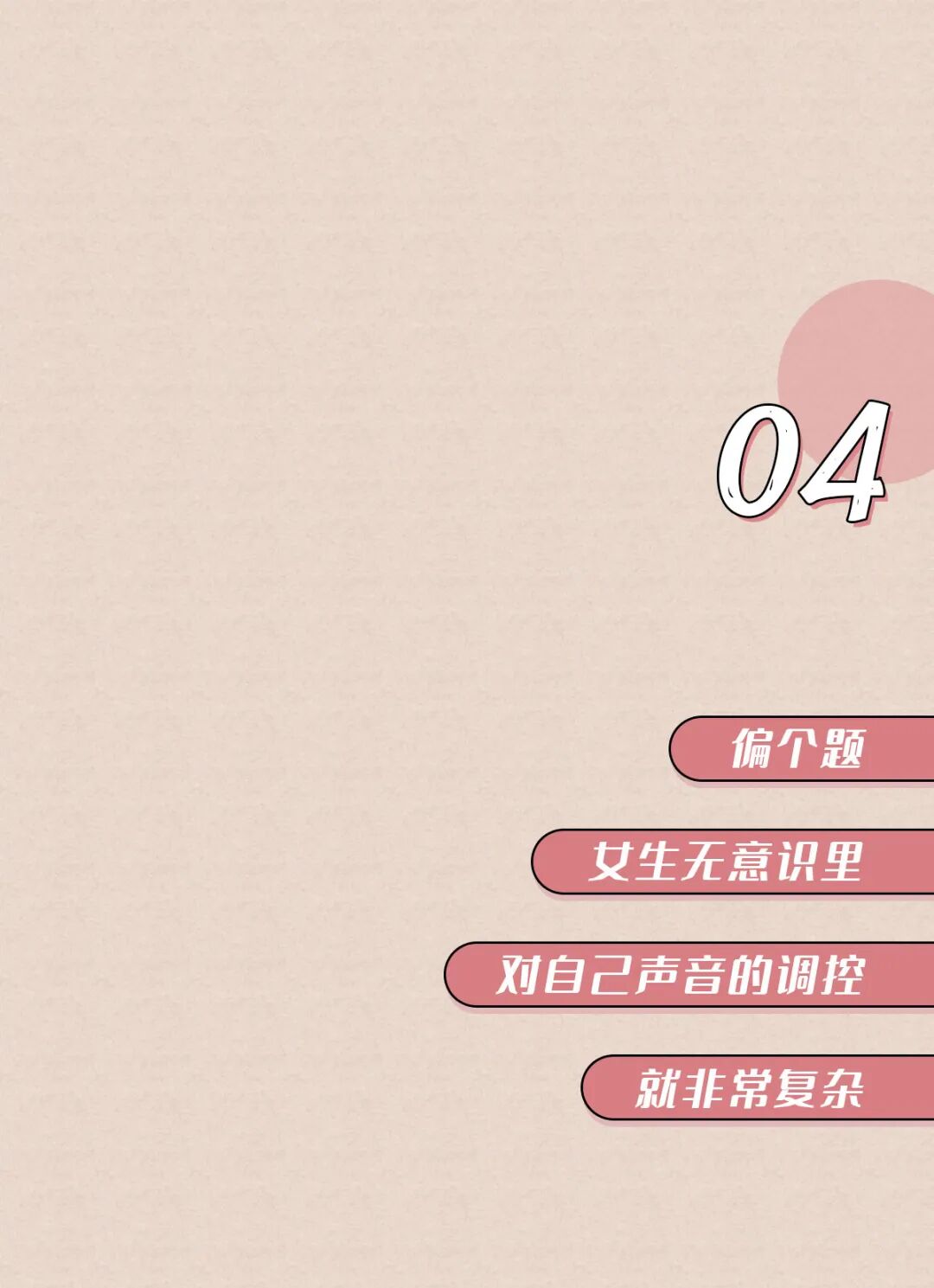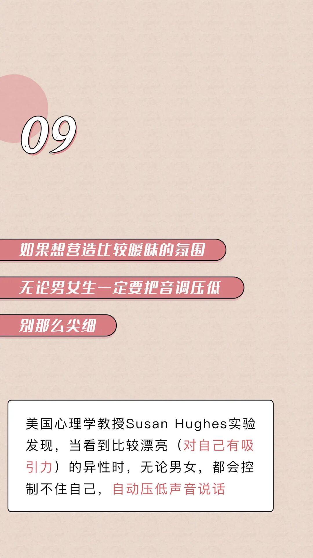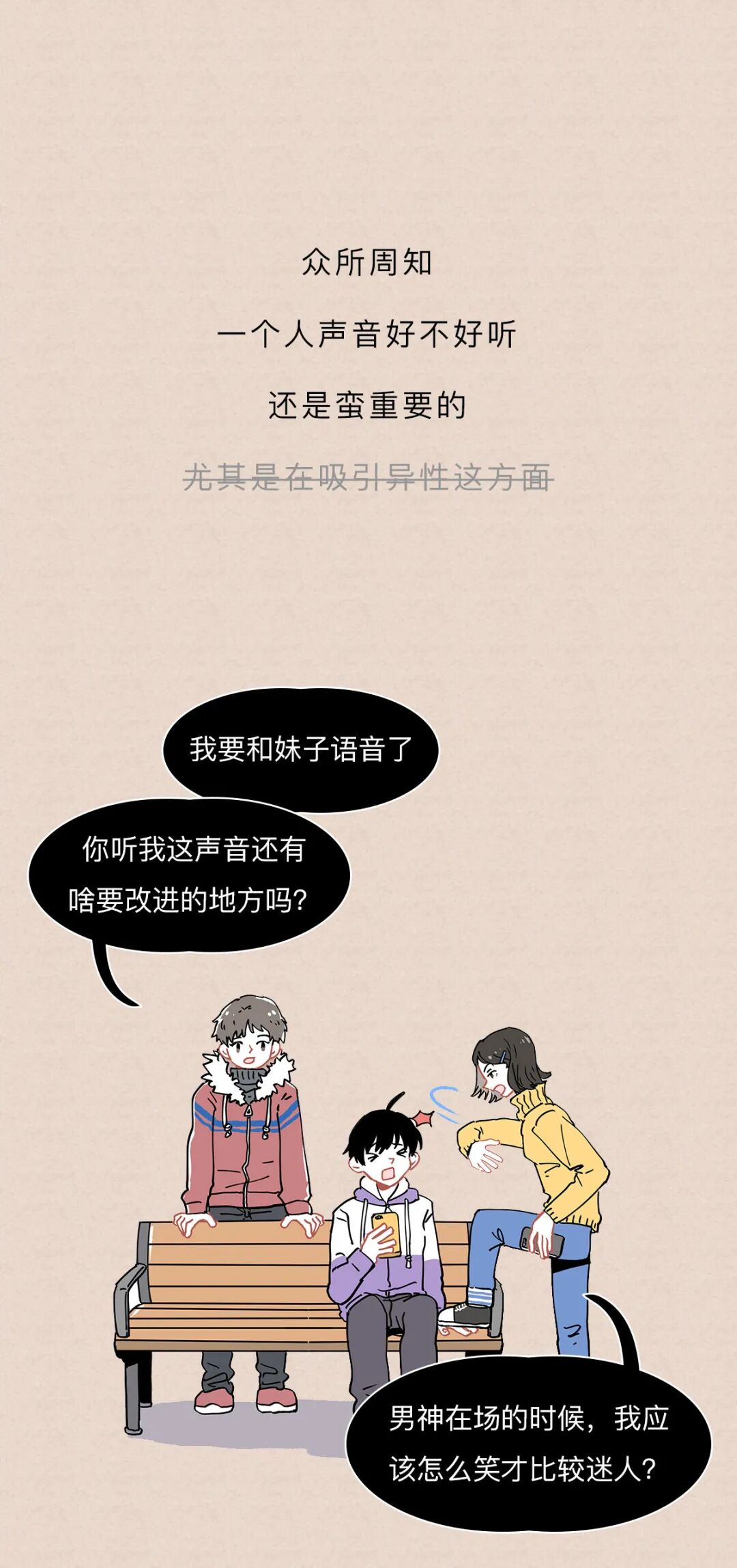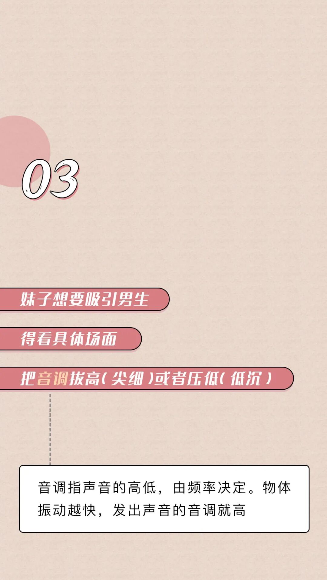 低沉的声音能让人觉得,男生长得高大,强壮有力,生殖能力强,嗯最后一点有点争议语调的结论来自苏特兰斯特林大学的研究;气息音的结论来自英国伦敦大学学院的语言学家许毅的研究《Evolutionary Psychology》上的《Your Cheatin’ Voice Will Tell on You: Detection of Past Infidelity from Voice》提了这事来自《Royal Society》上的文章《Voice pitch modulation in human mate choice》,上面说到的《Your Cheatin’ Voice Will Tell on You: Detection of Past Infidelity from Voice》也提了这事姨妈期声音不好听那事,是美国亚当斯州立学院的Nathan Pipitone和纽约州立大学奥尔巴尼分校的Gordon Gallup做的测试,他们招了10个妹子,让她们在月经周期的不同时间各录4段声音(分别在排卵期、姨妈期等时间录)然后拿这些录音给男性听,让他们选出每个妹子最没吸引力的那段录音,结果姨妈期录音被选出来的概率是34%(如果这些声音吸引力一样的话,那应该是25%的概率)来自《Psychology Today》上的文章《How to Improve the Sound of Your Voice》