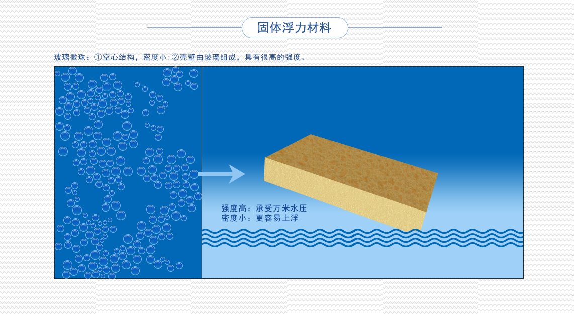 完成潜水工作后,“奋斗者”号又是如何安全返回水面的呢?这主要是浮力材料的功劳。浮力材料是成千上万个纳米级大小的玻璃微珠,它们不仅能为潜水器提供足够的浮力,自身也非常结实,经得起海底水压的考验。