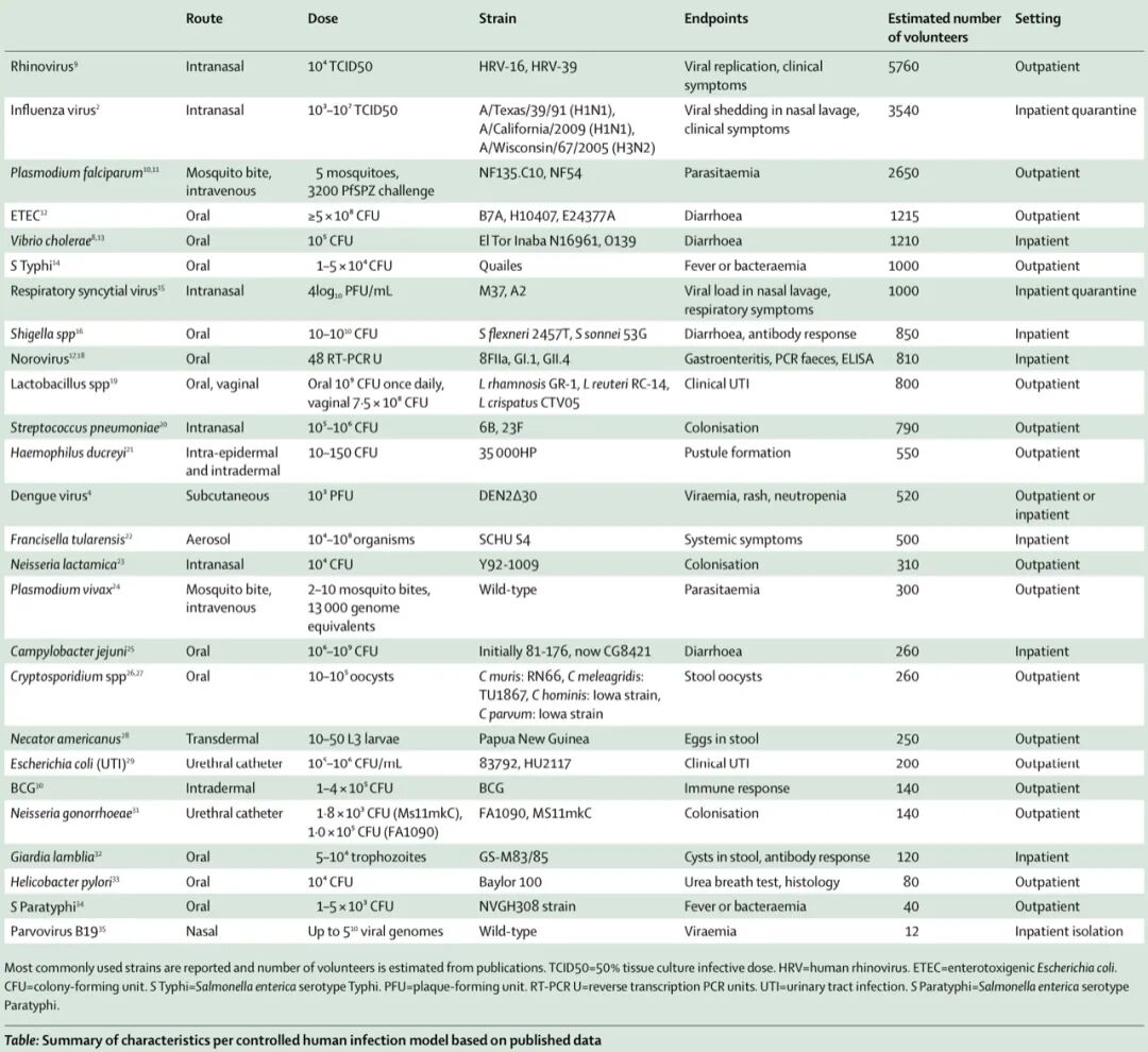 近几十年对十多种病毒的CHI试验。(图片来源:Roestenberg et al., Lancet Infect. Dis.)