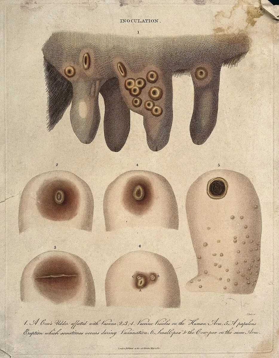 1796年5月14日,"疫苗之父"[注1]爱德华·詹纳(Edward Jenner)在英格兰西南部的小镇伯克利(Berkeley)进行了举世闻名的“牛痘接种试验”。这项实验受到了民间传闻的启发:一个人只要染上过牛痘,就不会再患上天花。詹纳将挤奶工萨拉·尼尔姆斯(Sarah Nelmes)牛痘脓包里的脓水接种到了8岁的詹姆斯·费普斯(James Phipps)的皮肤下。在接下来的几天中,费普斯经历了短暂的低烧。一段时间后,詹纳为费普斯进行了多次天花病毒皮下注射,但费普斯都没有表现出任何病症,詹纳由此断定,费普斯接种的牛痘成功为他提供了天花免疫。为了确认“牛痘天花疫苗”的有效性,詹纳还为其他23名被试接种了同样的"牛痘天花疫苗"。结果显示,接种牛痘确实能提供天花免疫。詹纳称该方法为“预防接种”(vaccination),词源是拉丁文‘vacca’,意为“牛”。