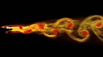 卡门涡街的形成可用雷诺数Re来描述,当雷诺数较小时,水流在管道中以层流的形式流动;当Re为50~300时,从物体上脱落的涡旋是有周期性规律的;当Re>300时涡旋开始出现随机性脱落;随着Re的继续增大,涡旋脱落的随机性也增大,最后形成了湍流。湍流现象在生活中随处可见,例如蚊香上白色烟会随着上升变成紊乱的“湍流”,水管里流出的水在大流量时为湍流小流量时为层流。湍流也在很多方面有所应用,飞机机翼上的翼刀将流过机翼上方的层流扰乱为湍流,从而解决大倾角爬升时的失速;高尔夫球上的不平整,两边通过的空气更快的形成为湍流,从而减少前后压强差给高尔夫球带来的阻力。“层流虽然美观,但湍流更加常见和具有魅力!”