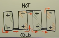 下面主要介绍温差生电的原理,我们首先考虑一个金属导体棒,在一端加热,另一端冷却,那么在热端的电子就会比冷端的电子拥有更多的能量,那么电子就会有一个宏观的从热端到冷端的扩散,从而在导体两端形成电压差。但这种电压往往很小,大部分金属的温差-电压转换系数(Seebeck系数)约为1~10μV/K。因此在实际的应用中往往使用半导体,利用半导体载流子可带正电可带负电的性质,形成下图中所示的通路,这样我们就可以将很多的小的温差电元件串联起来得到较高的电压。
