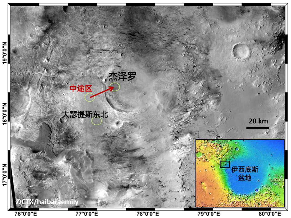 Part.2 “风水宝地”在哪里? 杰泽罗撞击坑位于北半球赤道附近(18.42°N,77.67°E),火星从南半球崎岖高地向北半球平坦低地过渡的交界上。