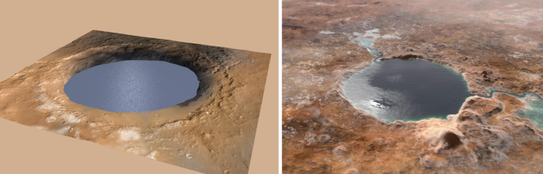 (左)盖尔撞击坑和(右)杰泽罗撞击坑有湖水状态的假想图 | NASA