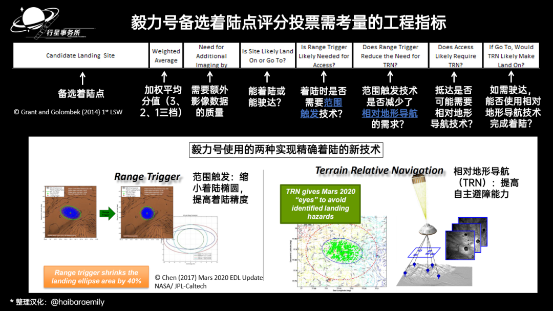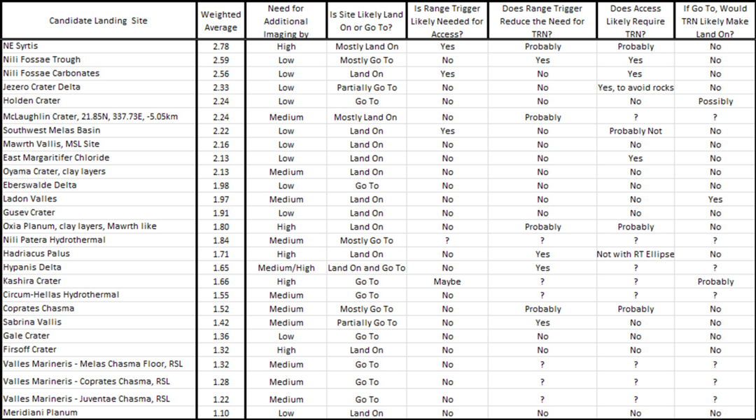 对这些备选着陆点,工程师和科学家们针对多项实际工程需求进行打分排序,主要考虑的工程需求有:需要额外影像数据的质量、能否着陆或驶达、是否需要启用两项精确着陆新技术(范围触发技术和相对地形导航技术)等等。