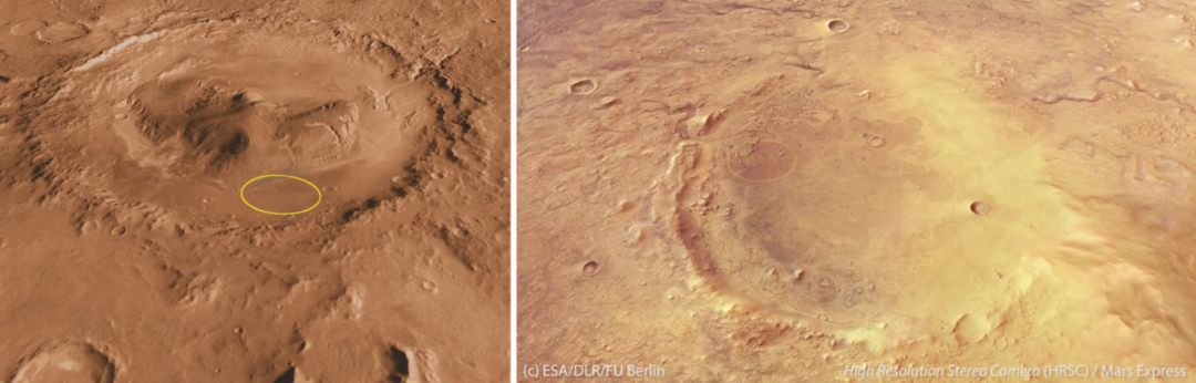 (左)盖尔撞击坑,基于NASA多个火星环绕器影像数据的电脑模拟;(右)杰泽罗撞击坑,火星快车HRSC影像