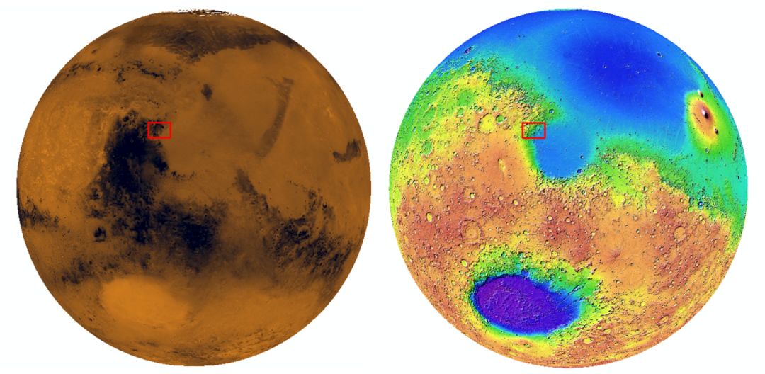 杰泽罗撞击坑位于红框区域中。(左)海盗号全球拼接影像;(右)MOLA地形(越蓝越低,越红越高)。来源:Viking/MOLA,制图:haibaraemily
