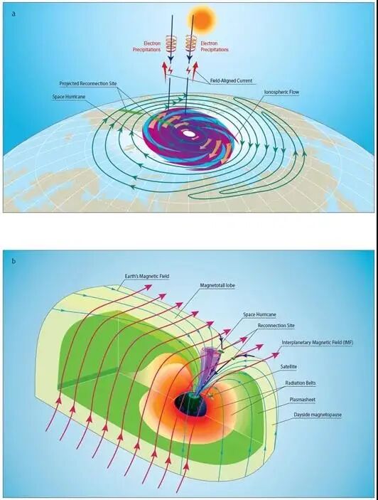 “太空台风”示意图 低层大气中发生的强烈热带气旋被称为台风或飓风。但在地球或者其他行星的高层大气中,是否也存在类似现象?2月22日,《自然·通讯》在线发表了山东大学空间科学研究院张清和教授领衔的国际团队最新研究成果,并被《自然》(Nature)选为了研究亮点。该研究中,科学家首次在地球极区电离层与磁层发现了类似台风或飓风的现象,并将其命名为“太空台风(Space hurricane)”,且揭示了其形成机制。 在张清和看来,与低层大气的中性粒子环境不同的是,高层大气(磁层和电离层)属等离子体(带电粒子)环境,如果真的存在台风或飓风现象,将预示着一次非常高效率的日地能量耦合过程。他表示,发现高层大气的这种特殊现象,将更新人们对太阳风-磁层-电离层耦合过程的认识。因此,全球科学家一直在努力寻觅它的踪影。 DMSP卫星的极光和AMPERE的场向电流观测图像。图像被投影在地磁与磁地方时坐标系中,是从北极上空往下看的效果。 该事件期间,中科院空间中心三维磁流体力学模拟的场向电流分布在磁层的三维切片图和在电离层的投影图以及部分磁力线的三维分布图。 不过,由于高层大气空间浩大、环境恶劣,长期以来这一区域内观测缺乏,类似台风或飓风的现象一直没有现身。 多年来,张清和带领团队与国内外研究者合作,利用系列先进的观测设备或装置以及计算机数值模拟,展开了系统研究。值得注意的是,该团队所采用的“利器”包括月球轨道卫星、电离层卫星和我国南北极地面台站等,以及中科院空间中心对相关事件的高时空分辨率三维太阳风-磁层-电离层耦合磁流体力学模拟。 研究的关键点出现在2014年8月20日。这一天,出现在北极的一种巨型极光亮斑引起研究人员的高度关注。当时,正处于一次长时间的地磁极端平静条件下,地球北极磁极点附近出现类似于台风气旋状的极光亮斑结构,其水平尺度超过1000公里。 “通常情况下,磁极点附近的极盖区是没有明显极光的,极光大都发生在纬度较低的极光椭圆内。”张清和指出,“而它的亮度比极光椭圆内的极光要强得多,所以显然这个亮斑不是我们见过的极光。” “太空台风”的形成在极区电离层和磁层的示意图 更为全面地观测数据表明,该结构伴随有明显强的亮斑状上行场向电流、强等离子体对流涡旋剪切、离子上行、局部电子温度上升1000K 以上、先负后正的双极磁场结构、沉降电子被加速到10keV以上、堪比超级磁暴的电子沉降能通量等特点。 对此,研究人员认为,其与台风或飓风的特征非常类似,包括中心处“台风眼”的等离子体速度接近为0、预示着磁场存在圆形扰动等。因此,他们将这一从未观察到的新现象命名为“太空台风”。 研究人员还经过进一步观测与模拟对比分析揭示了“太空台风”形成的机制。 这一长时间极端平静期内,发生在地球高纬磁层顶的较为稳定的尾瓣磁场重联及其引起的磁力线或磁流管的演化,促使在地球北极的磁极点上方的电离层与磁层形成了一个巨大的顺时针旋转的漏斗形磁螺旋结构。该结构形成了太阳风带电粒子直接进入地球中高层大气和电离层离子上行和逃逸至磁层的通道,极大提升了太阳风-磁层能量的耦合效率。同时,该结构所引起的极端空间天气环境也能直接影响相关区域内的无线通讯导航与定位、超视距雷达探测和卫星的正常运行等。 张清和表示,这一研究表明,在极端平静地磁条件下,极区仍可能存在堪比超级磁暴活动时的局地剧烈地磁扰动和能量注入现象,这更新了人们对极端平静条件下太阳风-磁层-电离层耦合过程的认识。 张清和为该研究论文的第一和通讯作者,美国约翰霍普金斯大学应用物理实验室研究员张永良及中科院空间中心研究员王赤团队等做出重要贡献。该项研究受国家自然科学基金、国家子午工程和国际空间科学研究所等项目支持。 ◎ 科技日报记者 王延斌 来源:科技日报 部分素材由山东大学研究团队、中国科学报提供,山东大学研究团队供图 编辑:黄磊(实习) 审核:朱丽 终审:冷文生