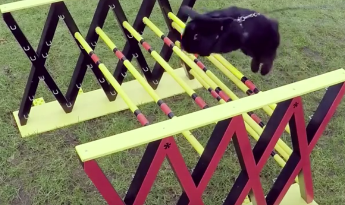 铲屎官牵着自家兔兔,比的就是跨栏。在十多个高矮不一的障碍之间冲刺跳跃,一决高下。