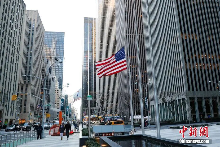 当地时间2月24日,美国纽约曼哈顿街道上的美国国旗降下半旗。中新社记者 廖攀 摄