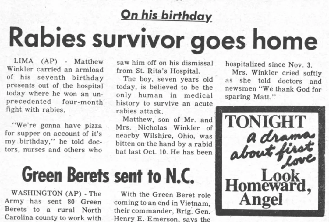 医生给这个名叫温克勒的男孩清理好伤口后,就让他爸爸带着他回家了。男人回到家中,非常不安,因为他知道,狂犬病一旦病发必死无疑。他这时候不可能意识到,后面会发生那么多出人意料的事。