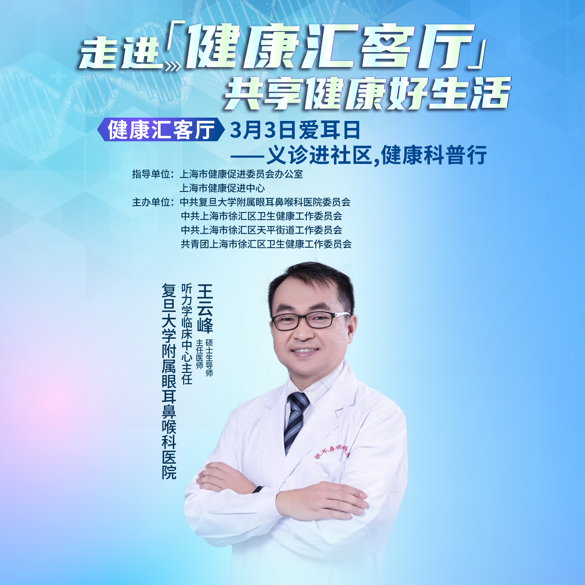 本次活动由上海市健康促进委员会办公室、上海市健康促进中心指导,中共复旦大学附属眼耳鼻喉科委员会、中共上海市徐汇区卫生健康工作委员会、中共上海市徐汇区天平街道工作委员会、共青团上海市徐汇区卫生健康工作委员会共同主办。