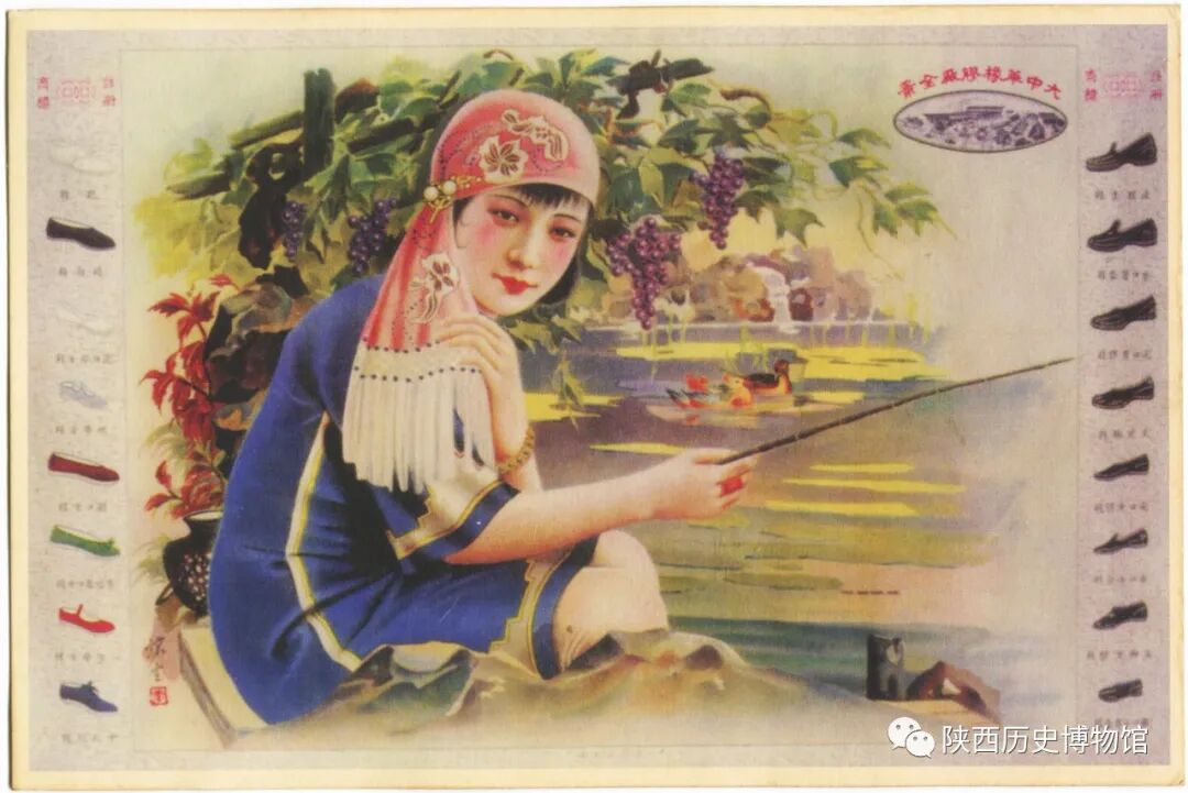 我们看到陕西历史博物馆收藏的这个女性垂钓图广告画(图四),是民国时期的,内容基本上延续了清代女子垂钓图的模式,只不过换成了一位民国时装美女。