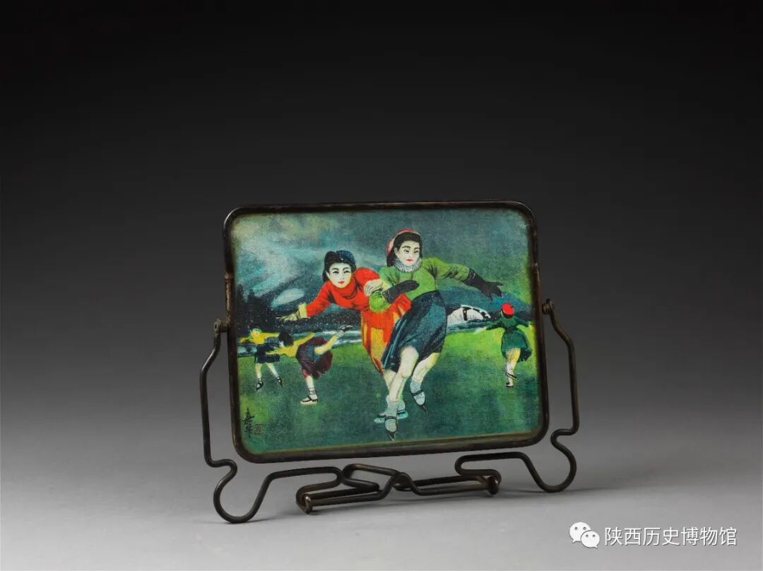 陕西历史博物馆也收藏了一件背面绘有民国至解放初期女性滑冰图的玻璃镜(图六)。这面玻璃镜为长方形,最长处28.8厘米,最宽处25厘米。玻璃镜由一周铁质黑框箍住,在镜的两侧,有铁质的镜架作为支撑。