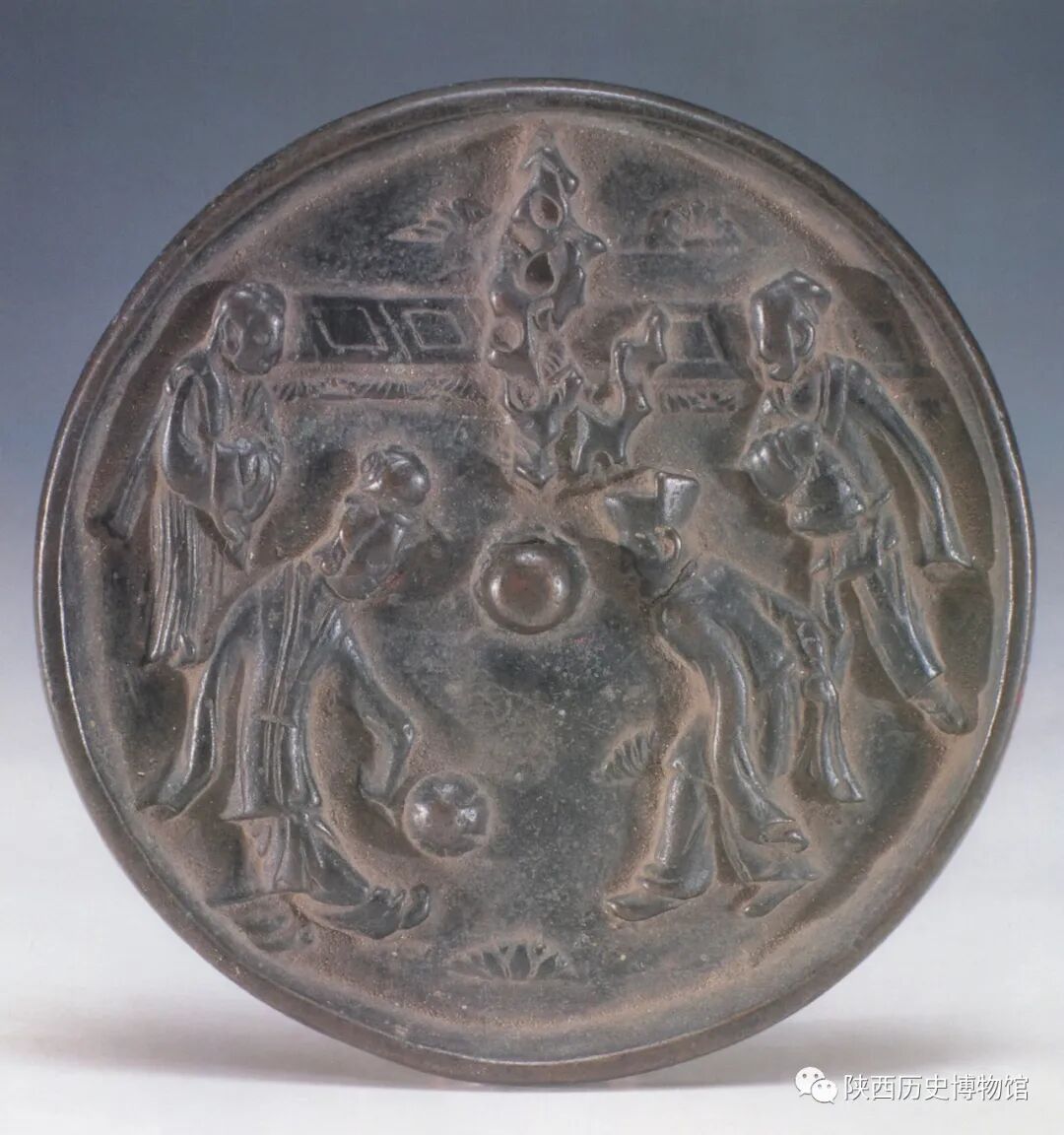 镜背绘制有滑冰图,画面上远景为银装素裹的山峦,近景是一处结冰的河流,冰上有五位女性正在滑冰。五位女子都穿着入时,中间的两位一红一绿。当前的女子身着草绿色高领上衣,墨绿色裙子,头戴红色帽子,戴黑色手套,双臂摆动,一足抬起正在努力向前滑。