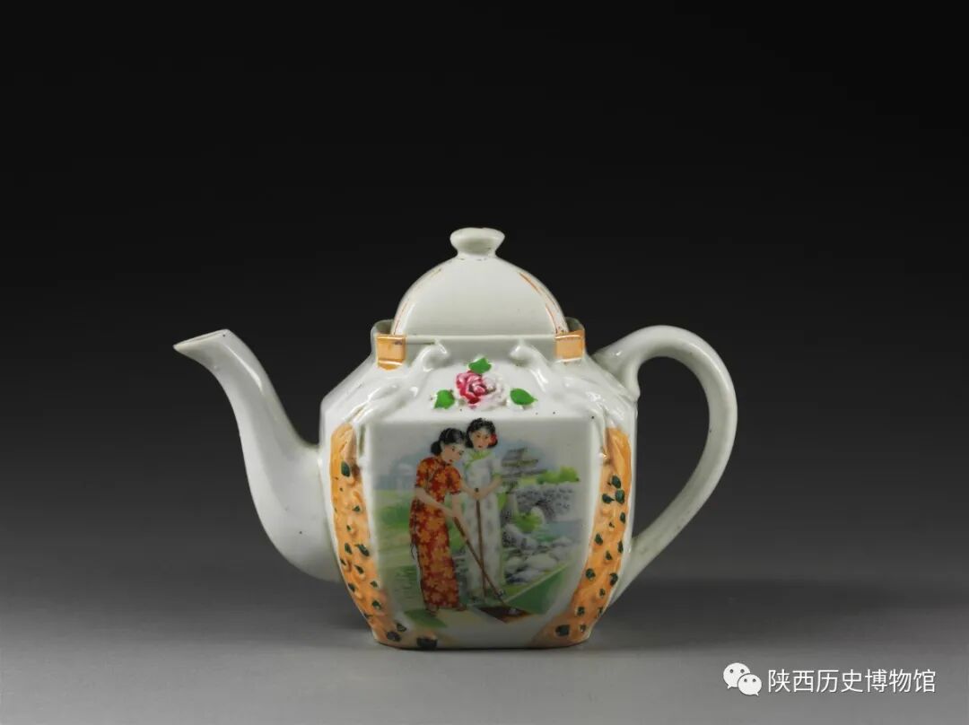 陕西历史博物馆收藏有一件民国时期的瓷茶壶,高14厘米,长16厘米,辞色洁白,壶身近长方形,短边两侧有流与柄,壶盖近覆斗形,盖顶有平顶小钮,便于持拿。