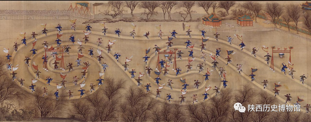 每年从八旗官兵中挑选“善走冰”的能手入宫训练,冬至到“三九”时在西苑冰上举行冰嬉。皇帝率王公大臣等前往观看,赛后皇帝分等次,恩赏银两。现在收藏在北京故宫博物院的清代金昆、程志道、福隆安等人绘制的《冰嬉图》长卷,就记录了当时“冰嬉庆典”的盛况(图五)。