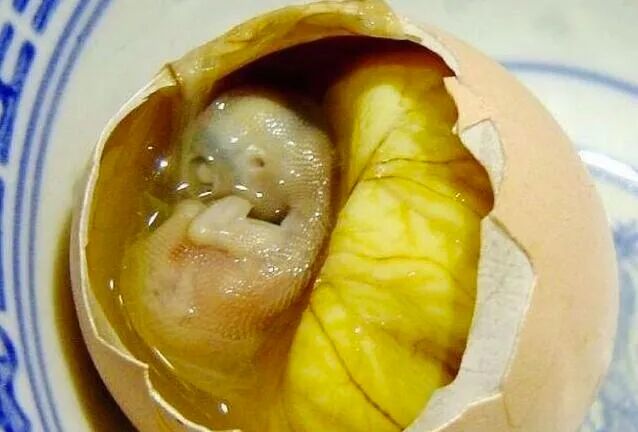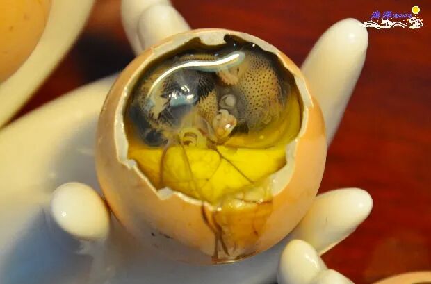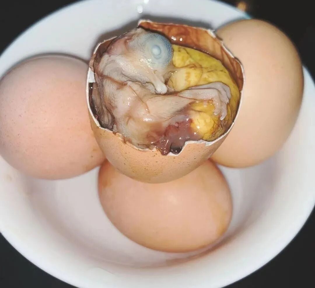 “蛋白在最底下,因为鸡蛋已经孵化了一段时间,比较硬,一般是不吃的,据说不消化。”