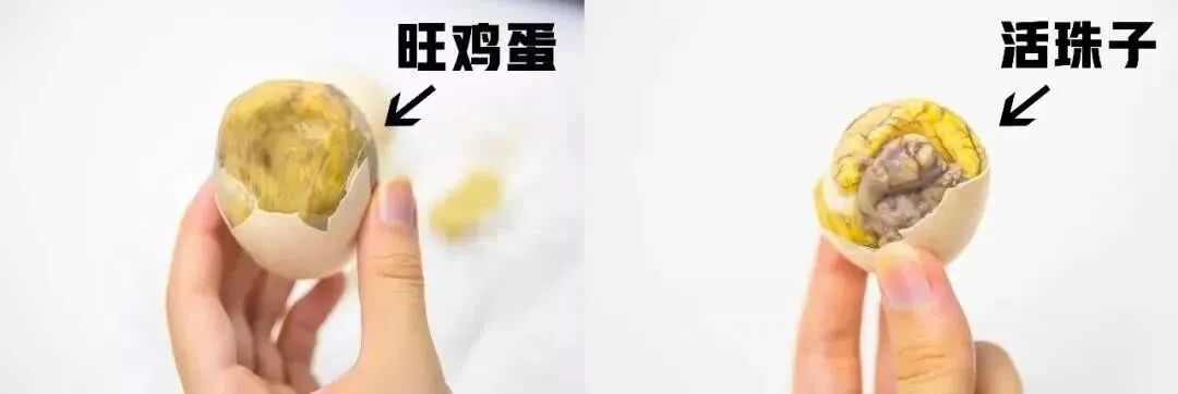 当鸡蛋即将孵成一个生命但是又没有完全成形,蛋里面已经有了头、翅膀、脚的痕迹,这种亦鸡亦蛋的鸡蛋孵化物叫做“活珠子”。因其发育中囊胚在透视状态下形如活动的珍珠,故称“活珠子”。