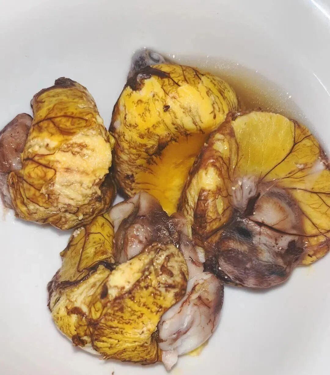 从外观来看,跟生鸡蛋一样,但是一但敲碎掰开,一般人直接劝退。