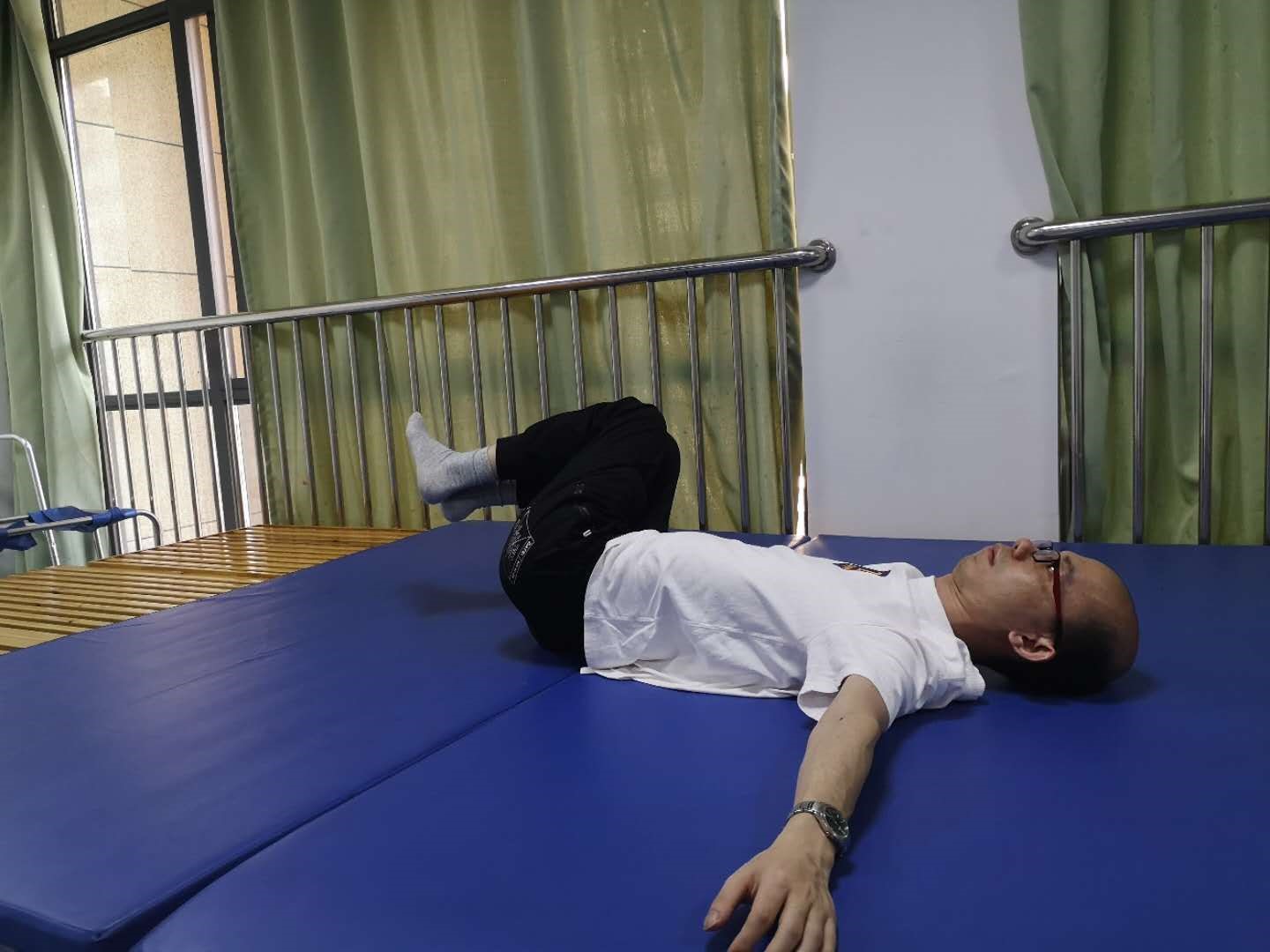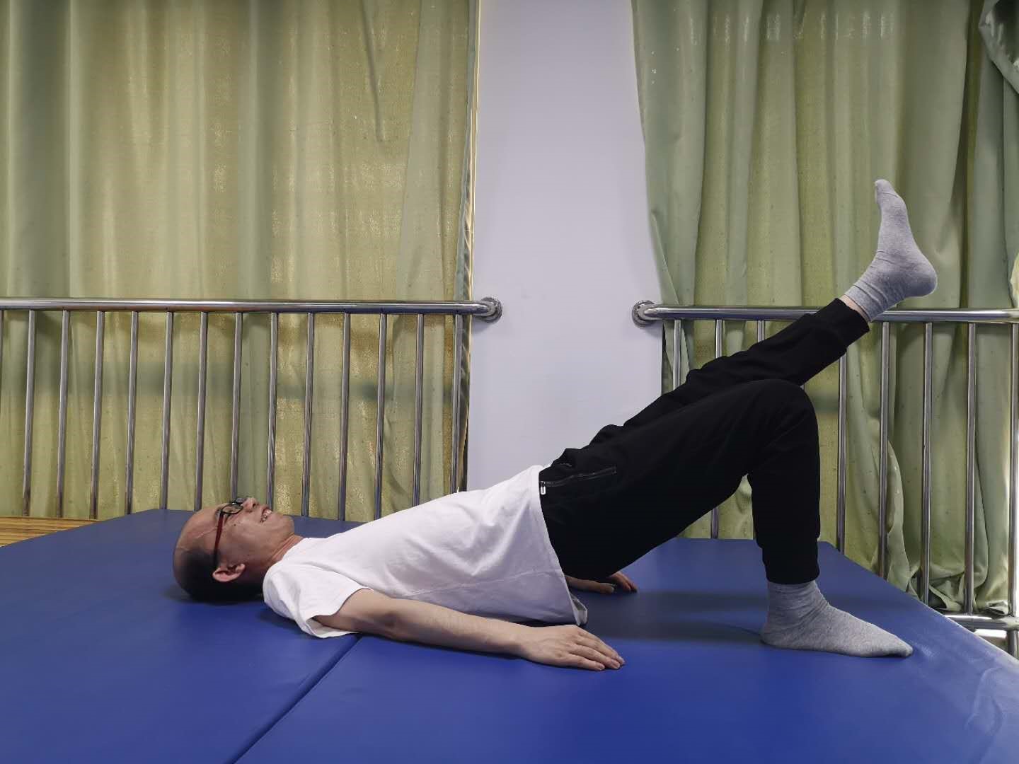 3.单腿臀桥:仰卧位,身体平躺床上,双手自然放于体侧手心朝下,一侧下肢屈膝,脚掌平放于床面上,另一侧下肢伸展与对侧下肢齐平。