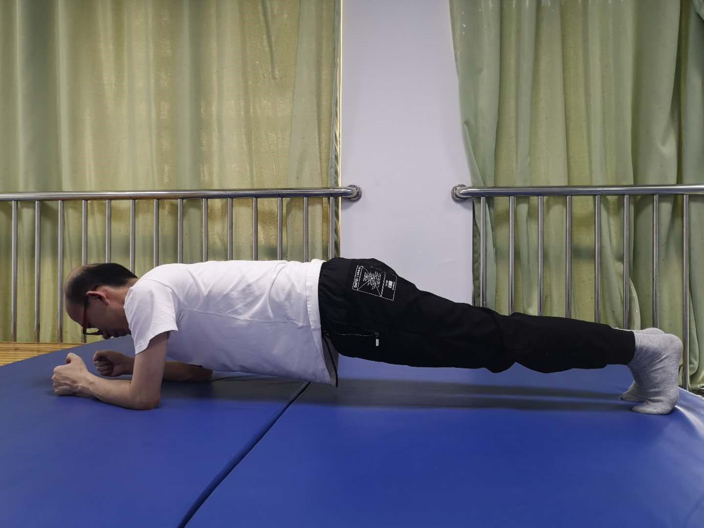 1.平板支撑:俯卧位,双肘弯曲支撑在地垫上,肩膀和肘关节垂直于地面,双脚后跟靠拢前半掌着地,身体离开地面,头部肩部髋部在一条直线上,腹肌收紧,脊柱保持正常生理弯曲,眼睛看向地面,保持均匀呼吸,注意不要拱背和塌腰。