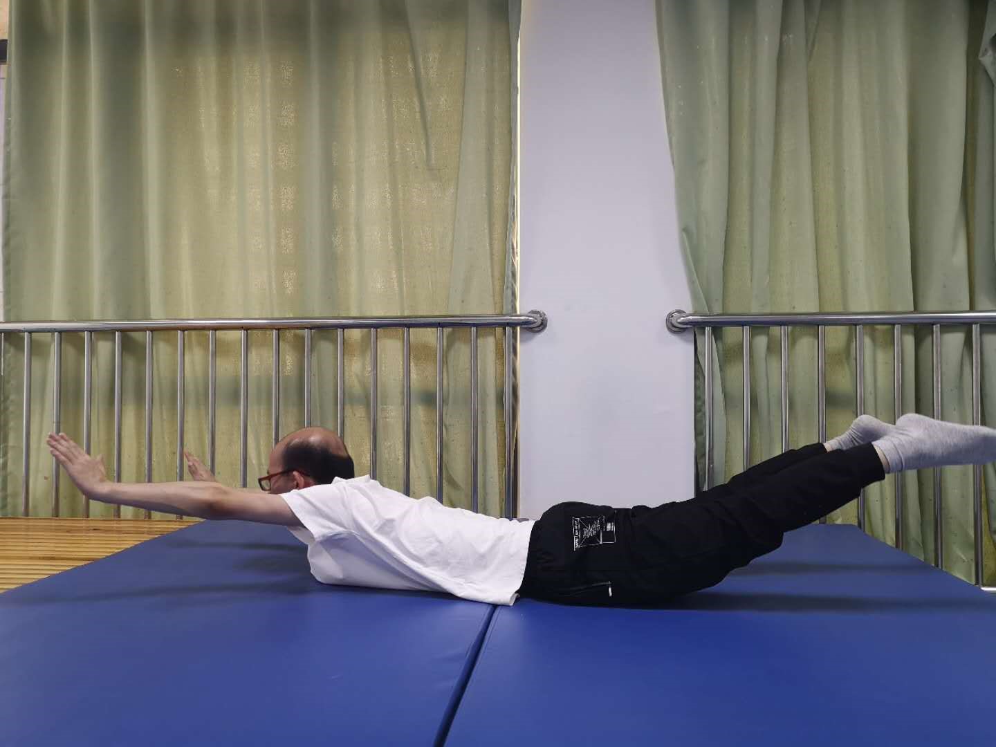 2.飞燕动作:俯卧位,以腰部为支撑点,双手伸展,放置于身体两侧、背部或者头部,适自身情况而定,同时用力抬起自己的双脚和头,抬离地面即可。