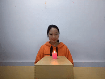 ①点燃一根蜡烛。孩子深吸一口气后,用力呼气将蜡烛吹灭。