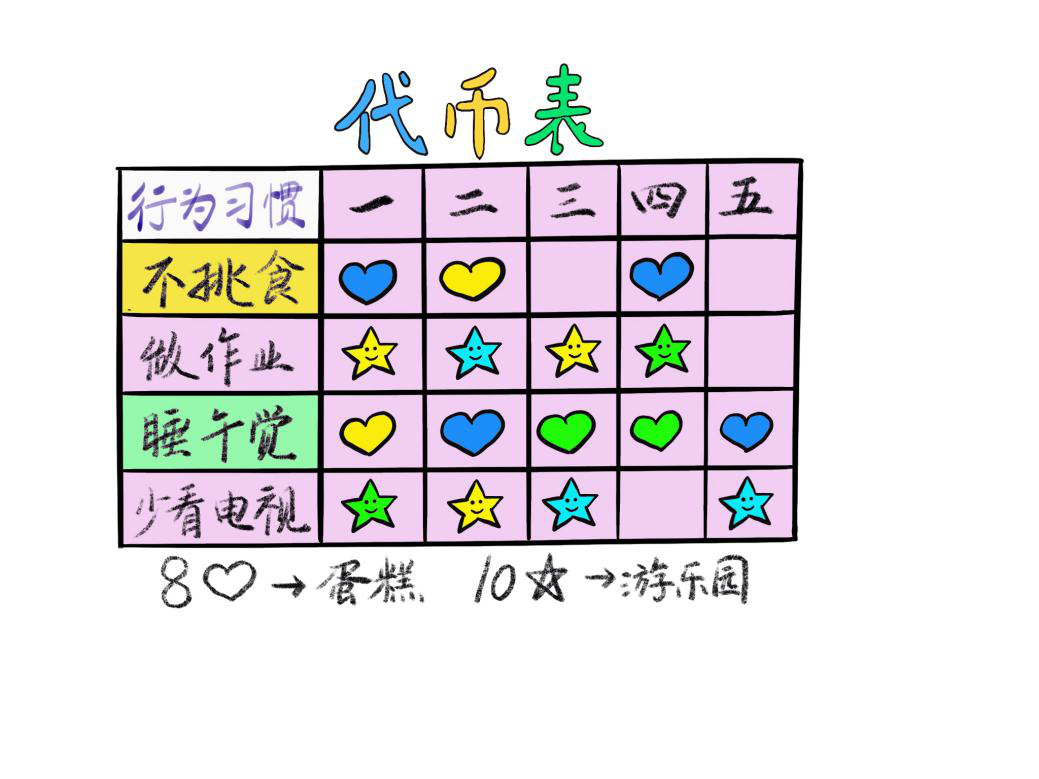 2.孩子通过做你想要他做的事情或者说好的行为发生时→可以得到代币(在这里,代币成为强化物。能够强化孩子反应的一切人、事、物,都可视为强化物)→代币的最终结果是孩子可以换得他喜欢的东西