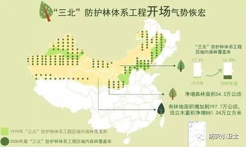 从沙源角度,覆盖或固定沙物质源是治理沙尘暴的根本途径。防护林正是利用森林的生态防护作用使沙物质源得到固定,部分覆盖。中国沙尘暴主要的境内源地集中在新疆南部、甘肃河西走廊、内蒙古西部等沙漠地区,三北防护林对于减少沙源区释尘量、减轻沙尘暴的危害发挥了作用。根据林业部门统计,到目前为止,沙化严重的西部地区平均森林覆盖率由5年前的9.03%提高到12.54%。