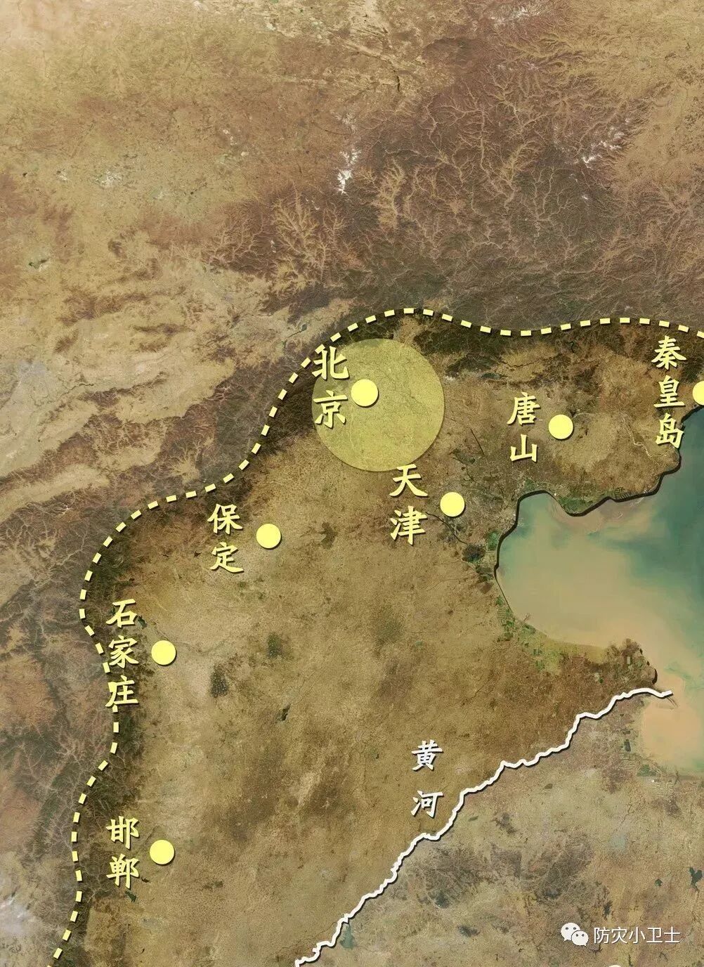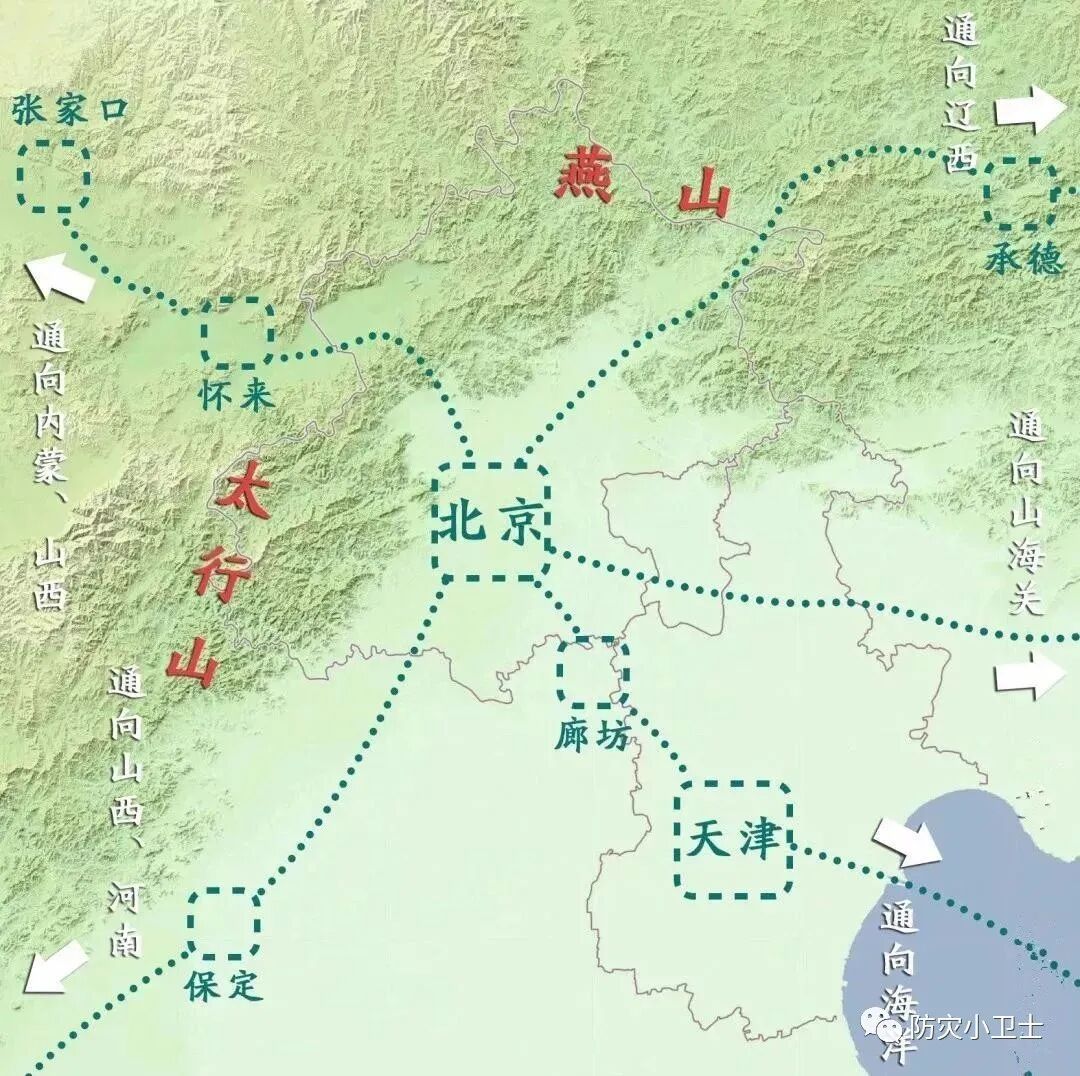 华北平原,即以北京、天津、河北西南部和东北部构成的广大平原地区,在西北方向上紧挨着太行山-燕山一线的山地。