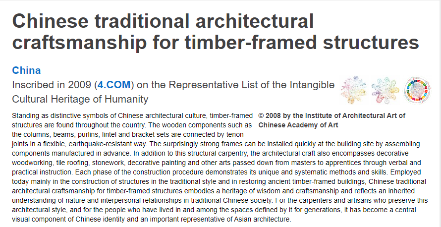 联合国教科文组织网站对“中国传统木结构营造技艺”项目的介绍图。图片来源:联合国教科文组织网站