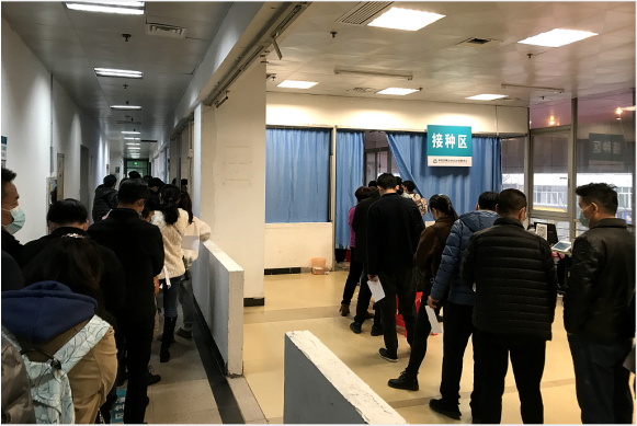 3月19日,湖北省武汉市汉阳区,市民在社区卫生服务中心排队免费接种新冠疫苗。