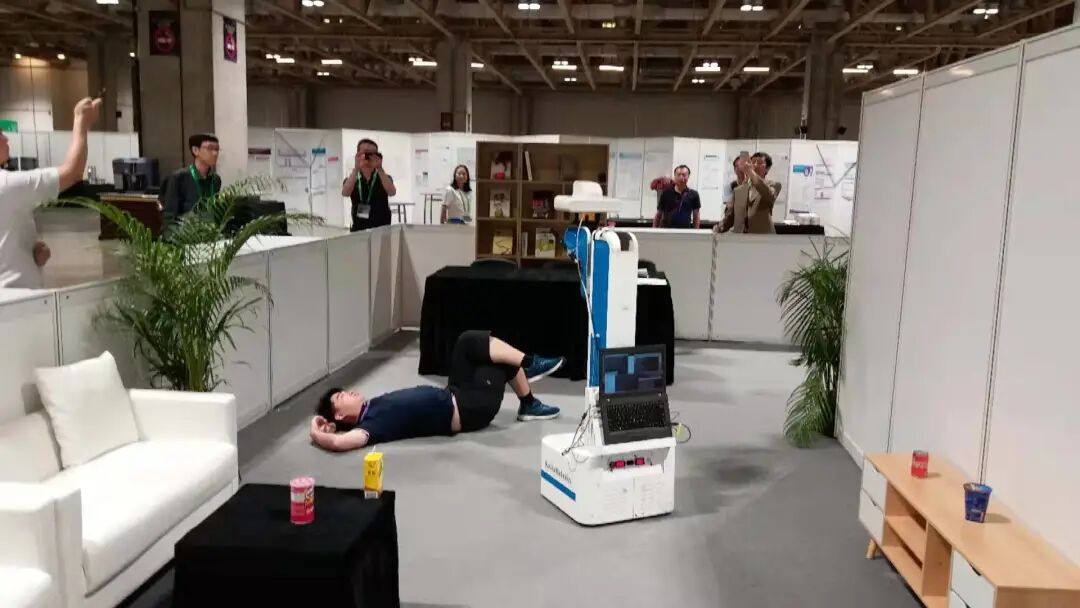 这张照片是我们在参加比赛时做的实验。我们的一名队员躺在地上,模拟的是老人在家摔倒了,但是家里没人,怎么办?机器人要发现老人摔倒了,还要走过去帮助老人。可能老人说,赶紧给我吃一粒速效救心丸,那机器人就要能把药找到。