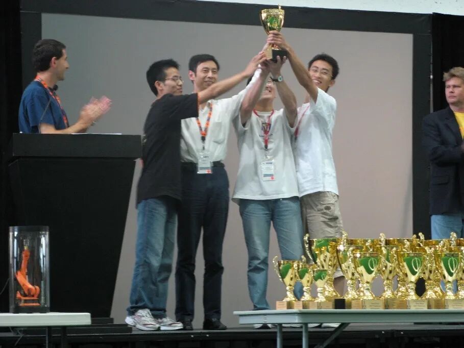 从2006年到前几年,我们一共得了12次世界冠军。这张照片是2007年在美国亚特兰大,左边是颁奖嘉宾彼得·斯通教授,他是国际人工智能青年科学家奖获奖者——这个奖每年只发给一位科学家。很荣幸,他也是参赛的选手,我们和他同场竞技。